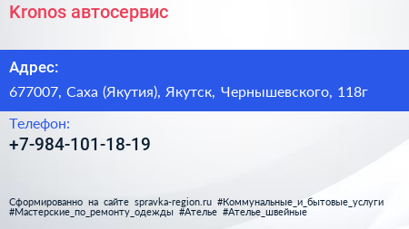 Kronos, автосервис по адресу 677007, Саха (Якутия), Якутск, Чернышевского, 118г в дальнейшем Организация, размещена в следующих категориях: