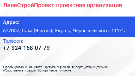ЛенаСтройПроект, проектная организация по адресу 677007, Саха (Якутия), Якутск, Чернышевского, 111/1а в дальнейшем Организация, размещена в следующих категориях: