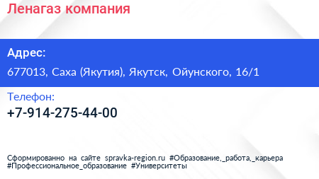 Ленагаз, компания по адресу 677013, Саха (Якутия), Якутск, Ойунского, 16/1 в дальнейшем Организация, размещена в следующих категориях: