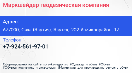 Маркшейдер, геодезическая компания по адресу 677000, Саха (Якутия), Якутск, 202-й микрорайон, 17 в дальнейшем Организация, размещена в следующих категориях: