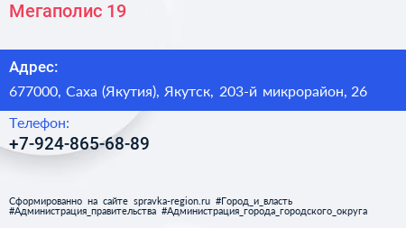 Мегаполис-19 по адресу 677000, Саха (Якутия), Якутск, 203-й микрорайон, 26 в дальнейшем Организация, размещена в следующих категориях: