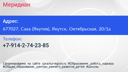 Меридиан по адресу 677027, Саха (Якутия), Якутск, Октябрьская, 20/1а в дальнейшем Организация, размещена в следующих категориях: