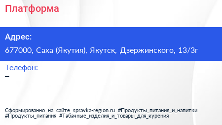 Платформа по адресу 677000, Саха (Якутия), Якутск, Дзержинского, 13/3г в дальнейшем Организация, размещена в следующих категориях: