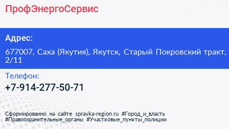 ПрофЭнергоСервис по адресу 677007, Саха (Якутия), Якутск, Старый Покровский тракт, 2/11 в дальнейшем Организация, размещена в следующих категориях: