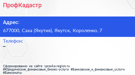 ПрофКадастр по адресу 677000, Саха (Якутия), Якутск, Короленко, 7 в дальнейшем Организация, размещена в следующих категориях:
