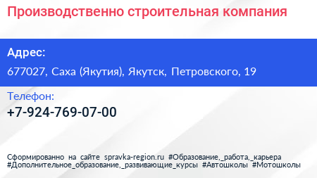 Производственно-строительная компания по адресу 677027, Саха (Якутия), Якутск, Петровского, 19 в дальнейшем Организация, размещена в следующих категориях: