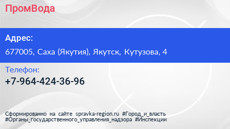 ПромВода по адресу 677005, Саха (Якутия), Якутск, Кутузова, 4 в дальнейшем Организация, размещена в следующих категориях:
