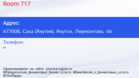 Room 717 по адресу 677008, Саха (Якутия), Якутск, Лермонтова, 66 в дальнейшем Организация, размещена в следующих категориях: