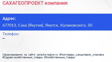 САХАГЕОПРОЕКТ, компания по адресу 677013, Саха (Якутия), Якутск, Кулаковского, 50 в дальнейшем Организация, размещена в следующих категориях: