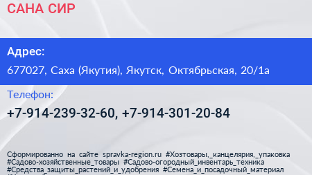 САНА СИР по адресу 677027, Саха (Якутия), Якутск, Октябрьская, 20/1а в дальнейшем Организация, размещена в следующих категориях: