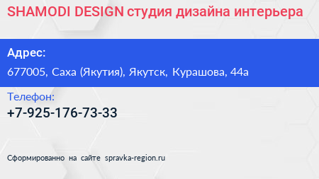 SHAMODI DESIGN, студия дизайна интерьера по адресу 677005, Саха (Якутия), Якутск, Курашова, 44а в дальнейшем Организация, размещена в следующих категориях:
