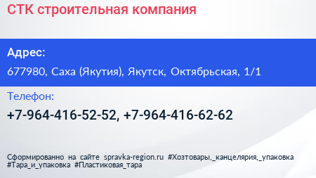 СТК, строительная компания по адресу 677980, Саха (Якутия), Якутск, Октябрьская, 1/1 в дальнейшем Организация, размещена в следующих категориях: