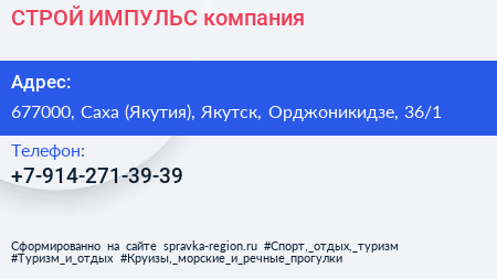 СТРОЙ ИМПУЛЬС, компания по адресу 677000, Саха (Якутия), Якутск, Орджоникидзе, 36/1 в дальнейшем Организация, размещена в следующих категориях: