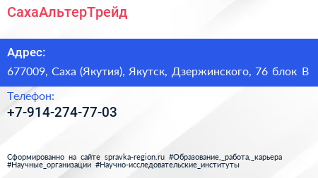 СахаАльтерТрейд по адресу 677009, Саха (Якутия), Якутск, Дзержинского, 76 блок В в дальнейшем Организация, размещена в следующих категориях: