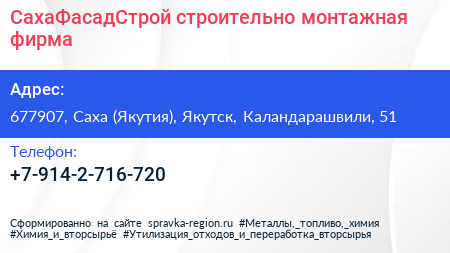 СахаФасадСтрой, строительно-монтажная фирма по адресу 677907, Саха (Якутия), Якутск, Каландарашвили, 51 в дальнейшем Организация, размещена в следующих категориях: