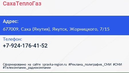 СахаТеплоГаз по адресу 677009, Саха (Якутия), Якутск, Жорницкого, 7/15 в дальнейшем Организация, размещена в следующих категориях:
