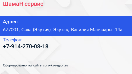 ШамаН сервис по адресу 677001, Саха (Якутия), Якутск, Василия Манчаары, 14а в дальнейшем Организация, размещена в следующих категориях: