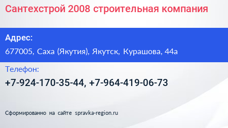 Сантехстрой 2008, строительная компания по адресу 677005, Саха (Якутия), Якутск, Курашова, 44а в дальнейшем Организация, размещена в следующих категориях: