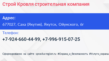 Строй-Кровля, строительная компания по адресу 677027, Саха (Якутия), Якутск, Ойунского, 6г в дальнейшем Организация, размещена в следующих категориях: