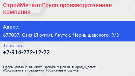 СтройМеталлГрупп, производственная компания по адресу 677007, Саха (Якутия), Якутск, Чернышевского, 9/3 в дальнейшем Организация, размещена в следующих категориях: