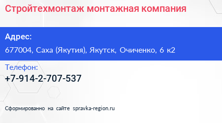 Стройтехмонтаж, монтажная компания по адресу 677004, Саха (Якутия), Якутск, Очиченко, 6 к2 в дальнейшем Организация, размещена в следующих категориях: