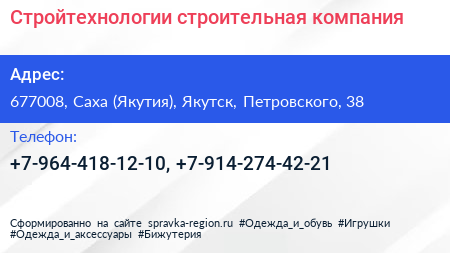 Стройтехнологии, строительная компания по адресу 677008, Саха (Якутия), Якутск, Петровского, 38 в дальнейшем Организация, размещена в следующих категориях: