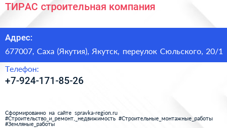 ТИРАС, строительная компания по адресу 677007, Саха (Якутия), Якутск, переулок Сюльского, 20/1 в дальнейшем Организация, размещена в следующих категориях: