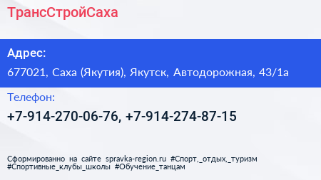 ТрансСтройСаха по адресу 677021, Саха (Якутия), Якутск, Автодорожная, 43/1а в дальнейшем Организация, размещена в следующих категориях: