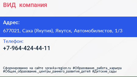 ВИД+, компания по адресу 677021, Саха (Якутия), Якутск, Автомобилистов, 1/3 в дальнейшем Организация, размещена в следующих категориях:
