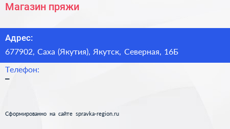 Магазин пряжи по адресу 677902, Саха (Якутия), Якутск, Северная, 16Б в дальнейшем Организация, размещена в следующих категориях: