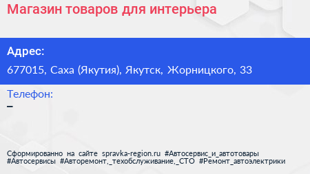 Магазин товаров для интерьера по адресу 677015, Саха (Якутия), Якутск, Жорницкого, 33 в дальнейшем Организация, размещена в следующих категориях: