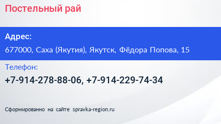 Постельный рай по адресу 677000, Саха (Якутия), Якутск, Фёдора Попова, 15 в дальнейшем Организация, размещена в следующих категориях: