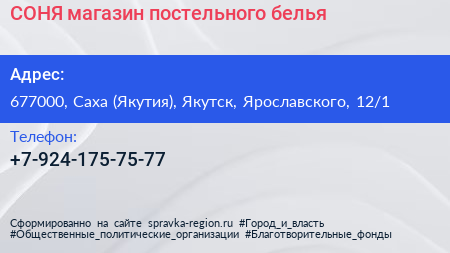 СОНЯ, магазин постельного белья по адресу 677000, Саха (Якутия), Якутск, Ярославского, 12/1 в дальнейшем Организация, размещена в следующих категориях: