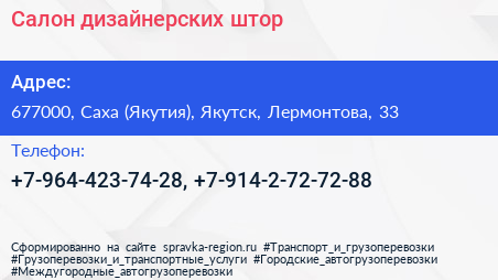 Салон дизайнерских штор по адресу 677000, Саха (Якутия), Якутск, Лермонтова, 33 в дальнейшем Организация, размещена в следующих категориях: