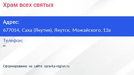 Храм всех святых по адресу 677014, Саха (Якутия), Якутск, Можайского, 13а в дальнейшем Организация, размещена в следующих категориях: