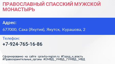 ПРАВОСЛАВНЫЙ СПАССКИЙ МУЖСКОЙ МОНАСТЫРЬ по адресу 677000, Саха (Якутия), Якутск, Курашова, 2 в дальнейшем Организация, размещена в следующих категориях: