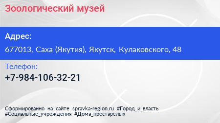 Зоологический музей по адресу 677013, Саха (Якутия), Якутск, Кулаковского, 48 в дальнейшем Организация, размещена в следующих категориях: