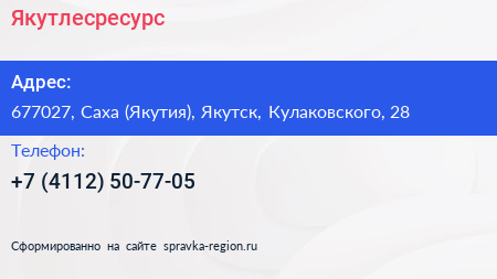 Якутлесресурс по адресу 677027, Саха (Якутия), Якутск, Кулаковского, 28 в дальнейшем Организация, размещена в следующих категориях: