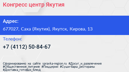 Конгресс-центр Якутия по адресу 677027, Саха (Якутия), Якутск, Кирова, 13 в дальнейшем Организация, размещена в следующих категориях: