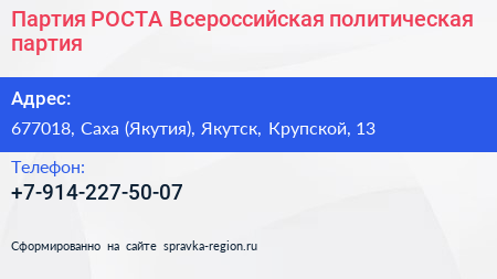Партия РОСТА, Всероссийская политическая партия по адресу 677018, Саха (Якутия), Якутск, Крупской, 13 в дальнейшем Организация, размещена в следующих категориях: