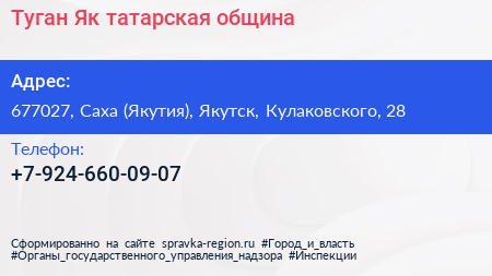 Туган Як, татарская община по адресу 677027, Саха (Якутия), Якутск, Кулаковского, 28 в дальнейшем Организация, размещена в следующих категориях: