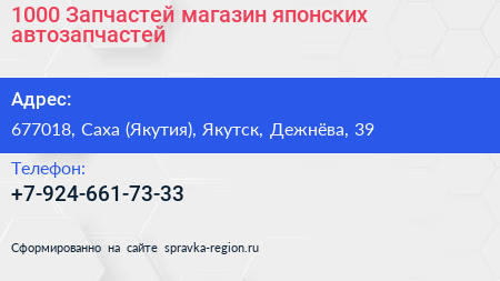 1000 Запчастей, магазин японских автозапчастей по адресу 677018, Саха (Якутия), Якутск, Дежнёва, 39 в дальнейшем Организация, размещена в следующих категориях: