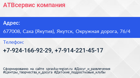 АТВсервис, компания по адресу 677008, Саха (Якутия), Якутск, Окружная дорога, 76/4 в дальнейшем Организация, размещена в следующих категориях: