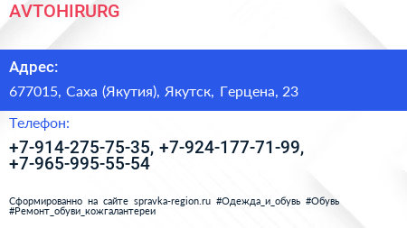 AVTOHIRURG по адресу 677015, Саха (Якутия), Якутск, Герцена, 23 в дальнейшем Организация, размещена в следующих категориях:
