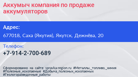 Аккумыч, компания по продаже аккумуляторов по адресу 677018, Саха (Якутия), Якутск, Дежнёва, 20 в дальнейшем Организация, размещена в следующих категориях: