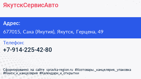 ЯкутскСервисАвто по адресу 677015, Саха (Якутия), Якутск, Герцена, 49 в дальнейшем Организация, размещена в следующих категориях: