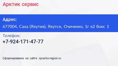 Арктик сервис по адресу 677004, Саха (Якутия), Якутск, Очиченко, 1г к2 бокс 1 в дальнейшем Организация, размещена в следующих категориях:
