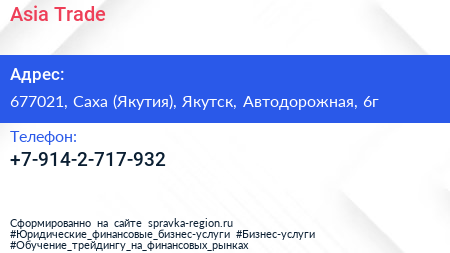 Asia Trade по адресу 677021, Саха (Якутия), Якутск, Автодорожная, 6г в дальнейшем Организация, размещена в следующих категориях: