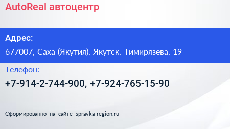 AutoReal, автоцентр по адресу 677007, Саха (Якутия), Якутск, Тимирязева, 19 в дальнейшем Организация, размещена в следующих категориях: