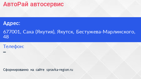 АвтоРай, автосервис по адресу 677001, Саха (Якутия), Якутск, Бестужева-Марлинского, 48 в дальнейшем Организация, размещена в следующих категориях: